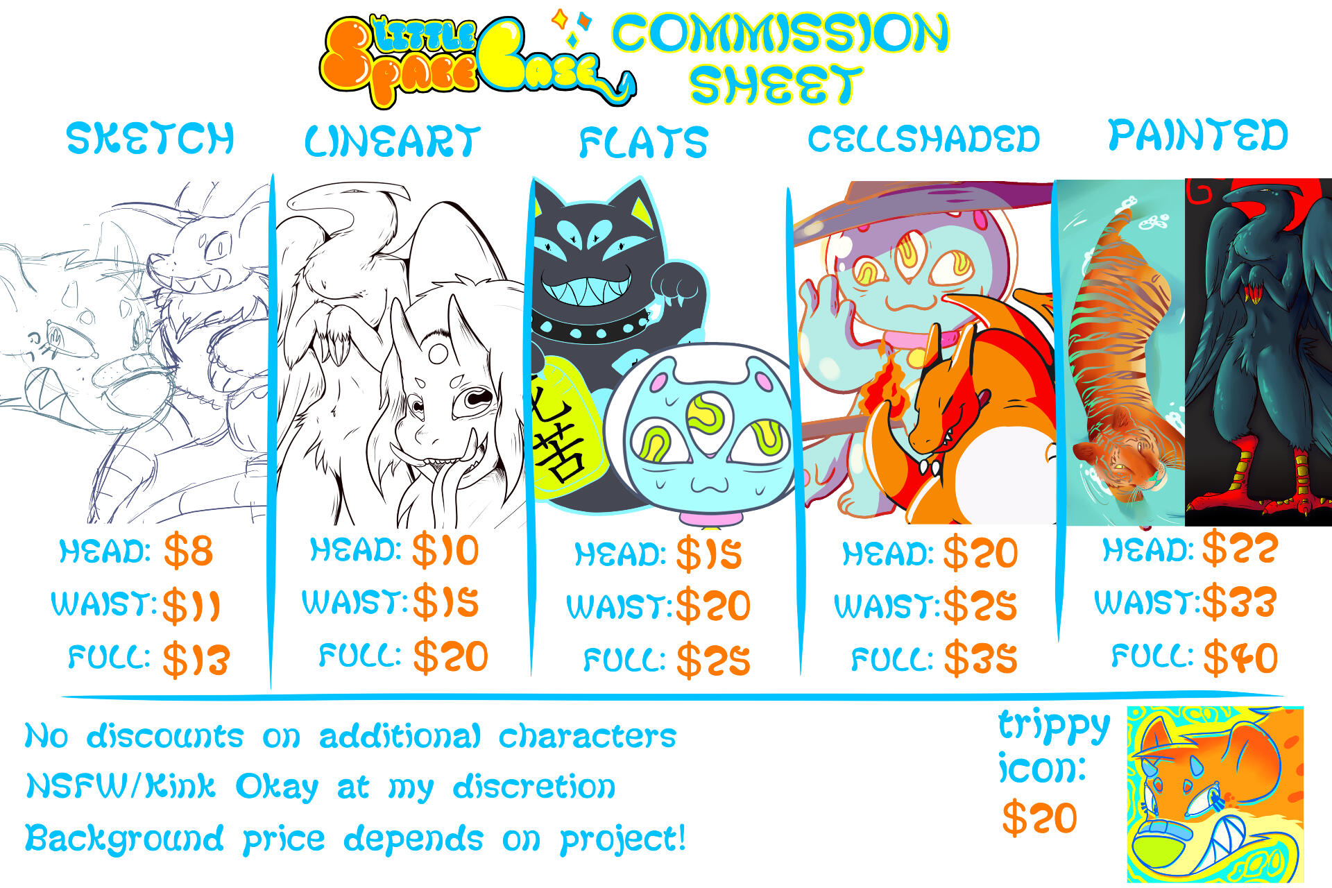 Traditional Sketch- $5 head shot, $8 waist up, $10 full bodyTraditional Fine Liner Line Art- $8 head shot, $10 waist up, $15 full bodyTraditional Brushpen Line Art- $12 head shot, $18 waist up, $25 full bodyDepending on the traditional line art style you chose, ADD the cost of color:Traditional Marker Color- +$7 head shot, +$15 waist up, +$18 full body